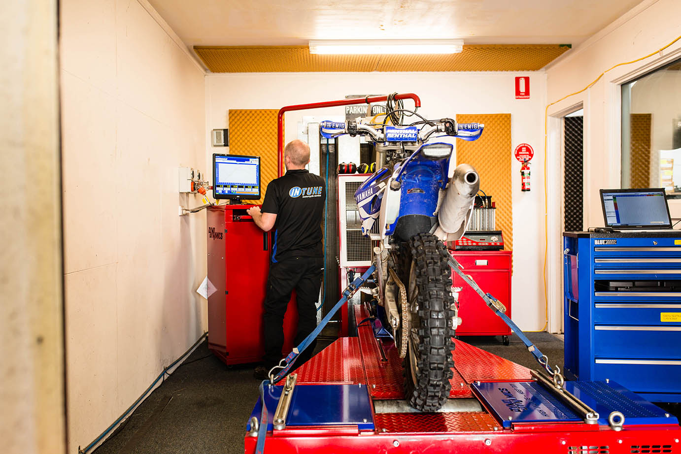 At Intune Motorcycles, we are equipped with our own Dyno facility.What is Dyno Tuning? Dyno Tuning allows us to measure the air-fuel ratio and the power output of your motorcycle within a controlled environment. What does this mean? This diagnostic tool known as a Dynamometer allows us to fine-tune your bike without the need of road testing it. This means that we can simulate any speed or load on your motorcycle at any RPM. Basically your motorcycle stays with us in the workshop over the entirety of the process.